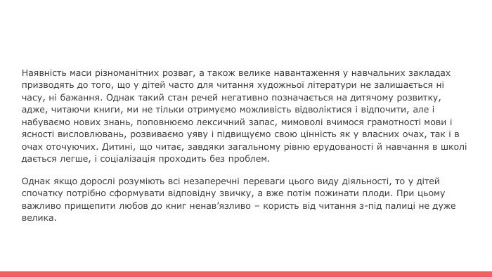 Книжки відкривають нам ті світи, про які ми навіть не здогадувалися. Варто тільки відкрити сторінку, і ти вже не дома, а в далекій казковій країні. Читання дає нам свободу обрати, ким бути: лицарем, принцесою чи веселим космонавтом.