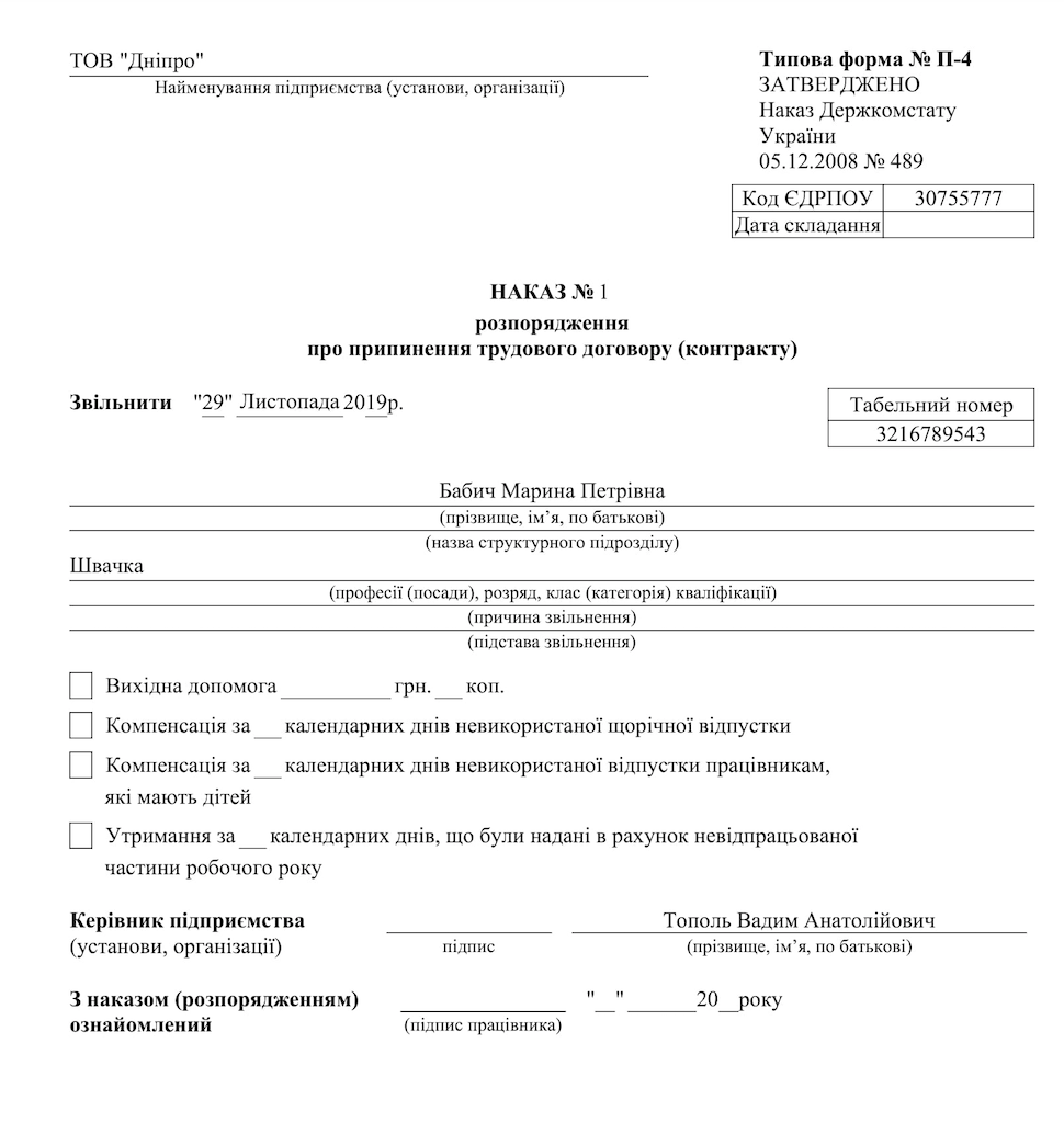 | Наказ про звільнення | Документ, що підтверджує факт звільнення працівника. |