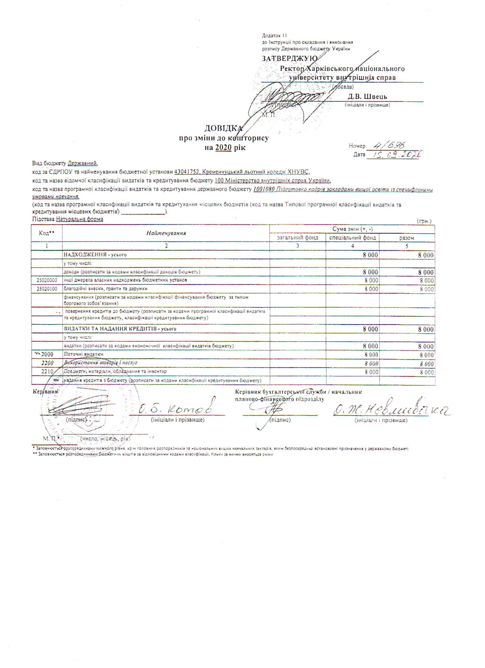 | Назва документу | Довідка про зміни до кошторису |