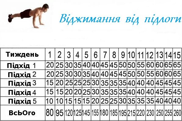 | Більше повторень | Цього тижня 20 віджимань, наступного — 30. |