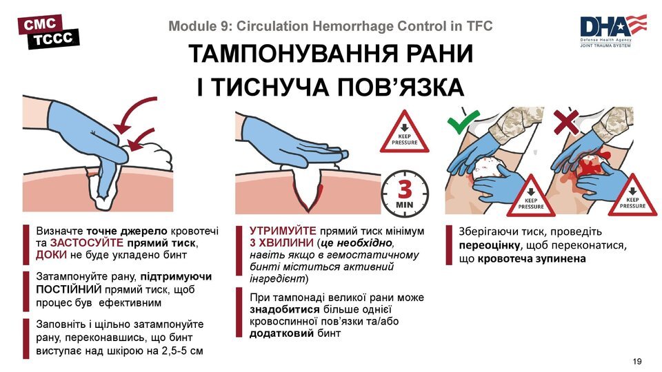 - Затягніть до повної зупинки кровотечі, це може бути боляче, але важливо для виживання.