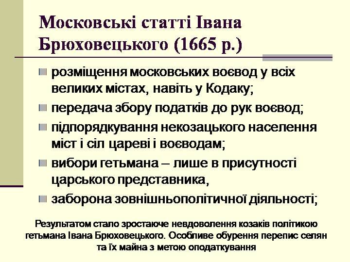 - Посилення залежності від Москви: Після підписання статей, вплив Московії на внутрішні справи Гетьманщини значно збільшився. Гетьманство ставало все більше залежним від зовнішньої політики Московії.