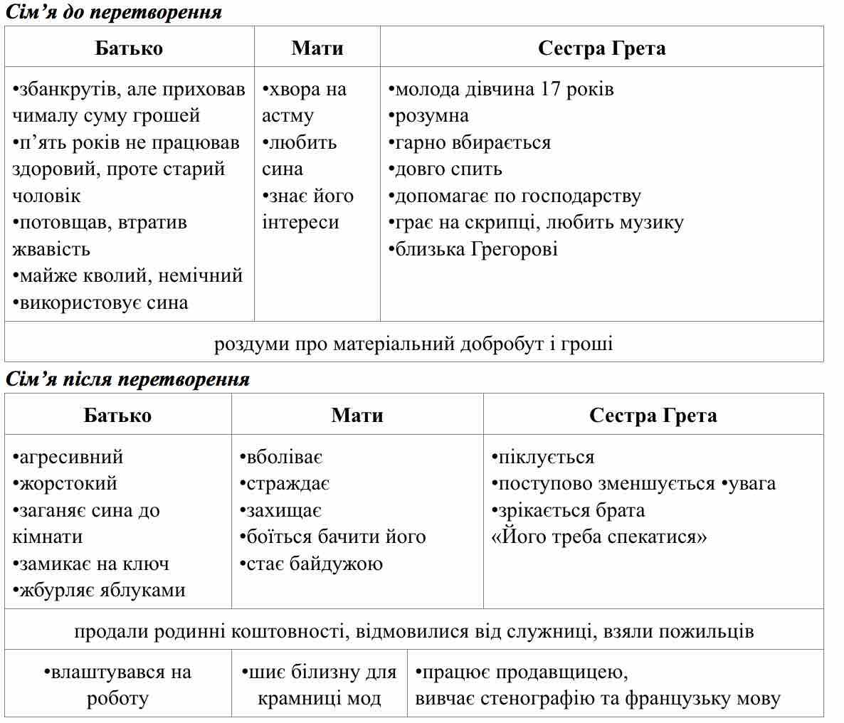 - Батько і мати Грегора: Вони поступово віддаляються від Грегора, і їх ставлення до нього відображає загальний процес відчуження у родині.