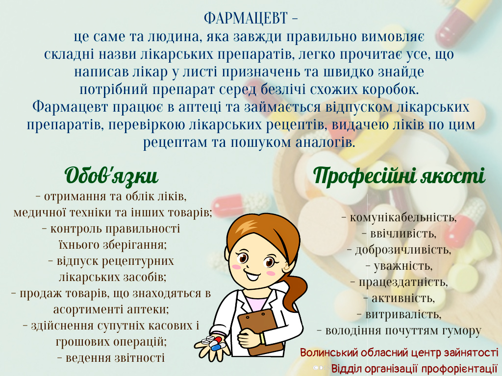 - Організаційні здібності: здатність організовувати робочий процес в аптеці та вести облік препаратів.