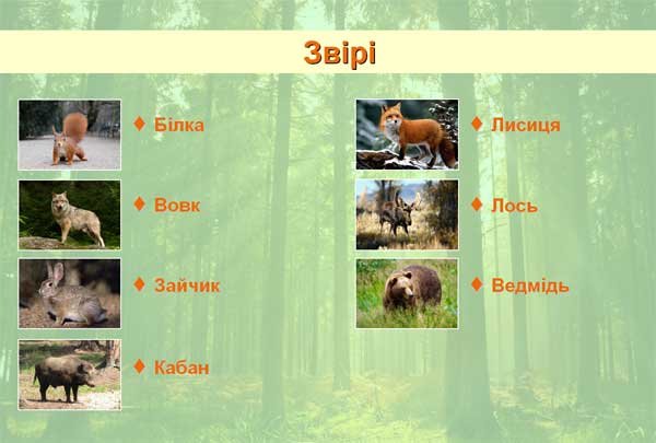 - Олень — ці граційні тварини часто асоціюються з лісами Європи і Америки. Вони є травоїдними та грають важливу роль у регуляції рослинності.