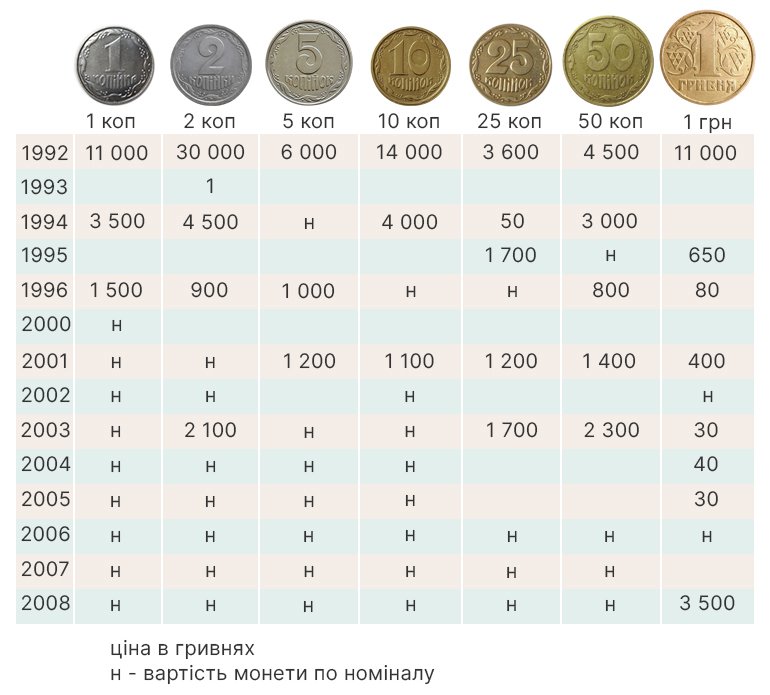 | 1 копійка | 1992 | 300-600 | Старий тираж, перший рік сучасної гривні, ціна зростає щороку. |