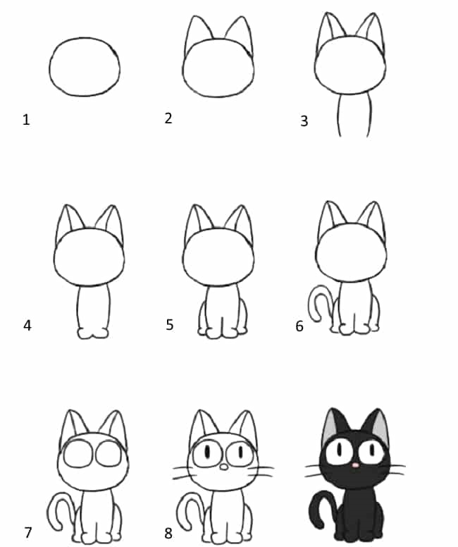 - Веселий котик: Овал — і готова мордочка, пару вусиків і хвостик. Такий котик займе всього кілька хвилин, але підніме настрій на цілий день!