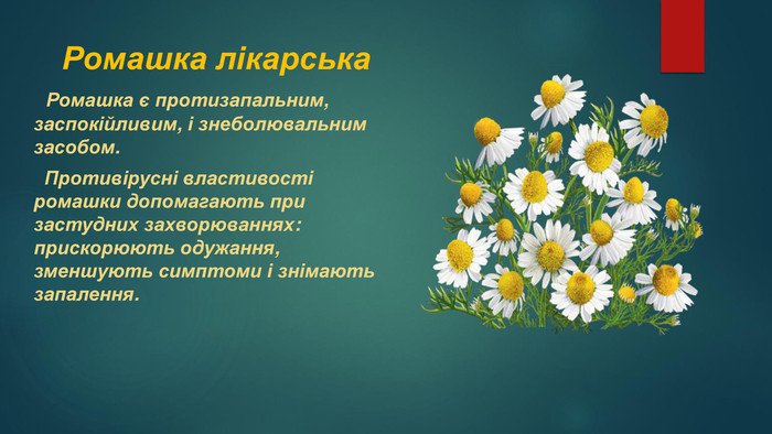 - Факт: Ромашка дійсно не може замінити серйозні ліки, але є важливим засобом відновлення здоров’я.