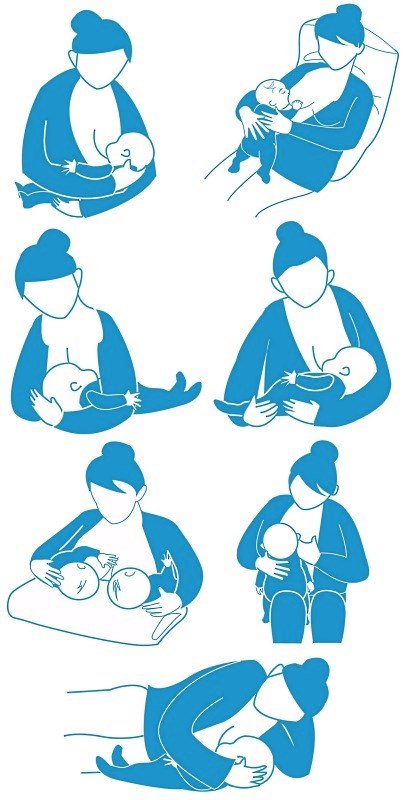 - Колискова поза. Цей метод найбільш поширений. Мати сидить, немовля спирається на її руку. Цей спосіб добре підходить для новонароджених, бо дозволяє контролювати голівку малюка.