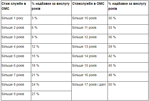 | Роки служби | % надбавки |