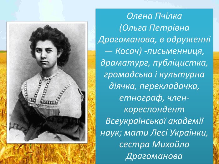 Не просто мати, а й енергійна муза для всього покоління — така була Олена Пчілка. Вона писала не лише ліричні поезії, але й прозу, переклади, казки для дітей. Із завидною завзятістю вона вкладала в кожен твір душу.