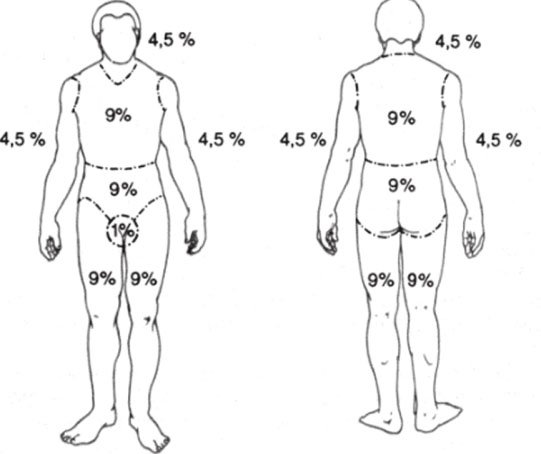 - Метод “Правило дев’яток” – швидкий спосіб оцінювання, де тіло ділиться на сегменти, кожен з яких приблизно відповідає 9% від загальної площі.