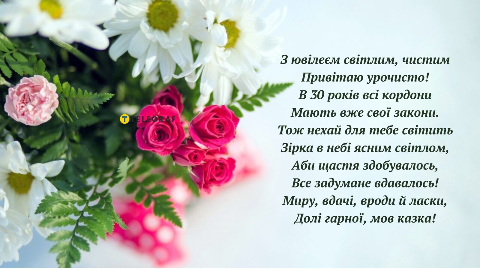 Тридцять років — це всього на всього початок. Початок нового десятиліття, повного відкриттів і звершень. Те, що ти досягла, тепер є твоїм фундаментом, на якому ростимуть нові бажання та цілі.