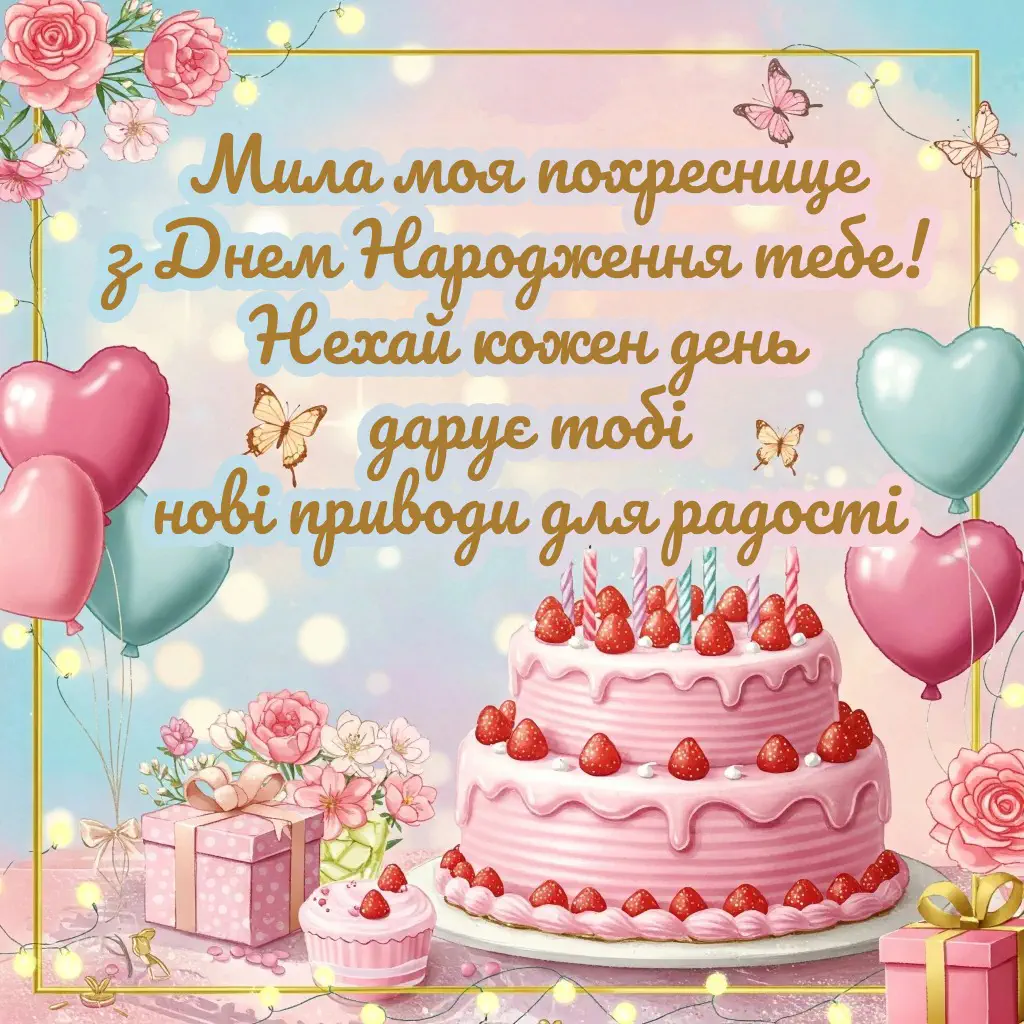 Дорога моя похреснице! Сьогодні особливий день, коли твоє сердечко наповнює радість, а усмішка сяє яскравіше за сонце. Цей текст не просто привітання — це глибоке чистосердечне зізнання у неосяжній любови до тебе. Моя зоре, нехай сьогодні буде найщасливішим днем у твоєму житті.