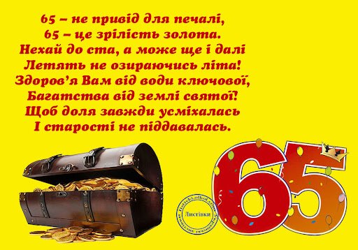 Шістдесят п’ять. І лише цифра. Посміхнися на цей ювілей ще раз. Бо життя триває, а ти тут, серед близьких та друзів, в колі тих, хто радіє з тобою.
