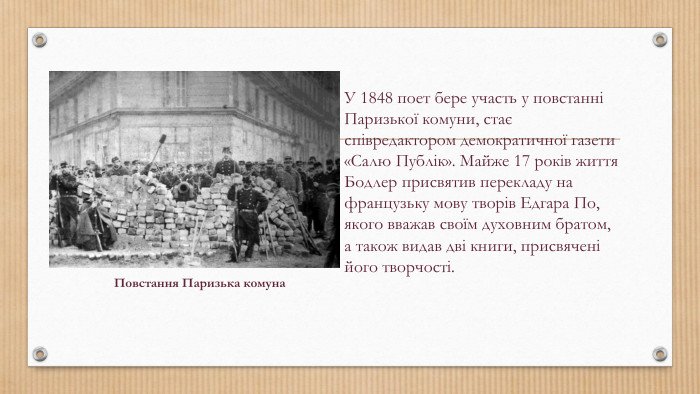 Бодлер з’явився на світ у Парижі 9 квітня 1821 року. Париж — це не просто місце народження, це місто, яке сформувало його душу. Втративши батька в шість років, маленький Шарль зіткнувся з реаліями життя. Усе змінилося з появою вітчима, генерала Жака Опіка, який став для нього строгим наставником.
