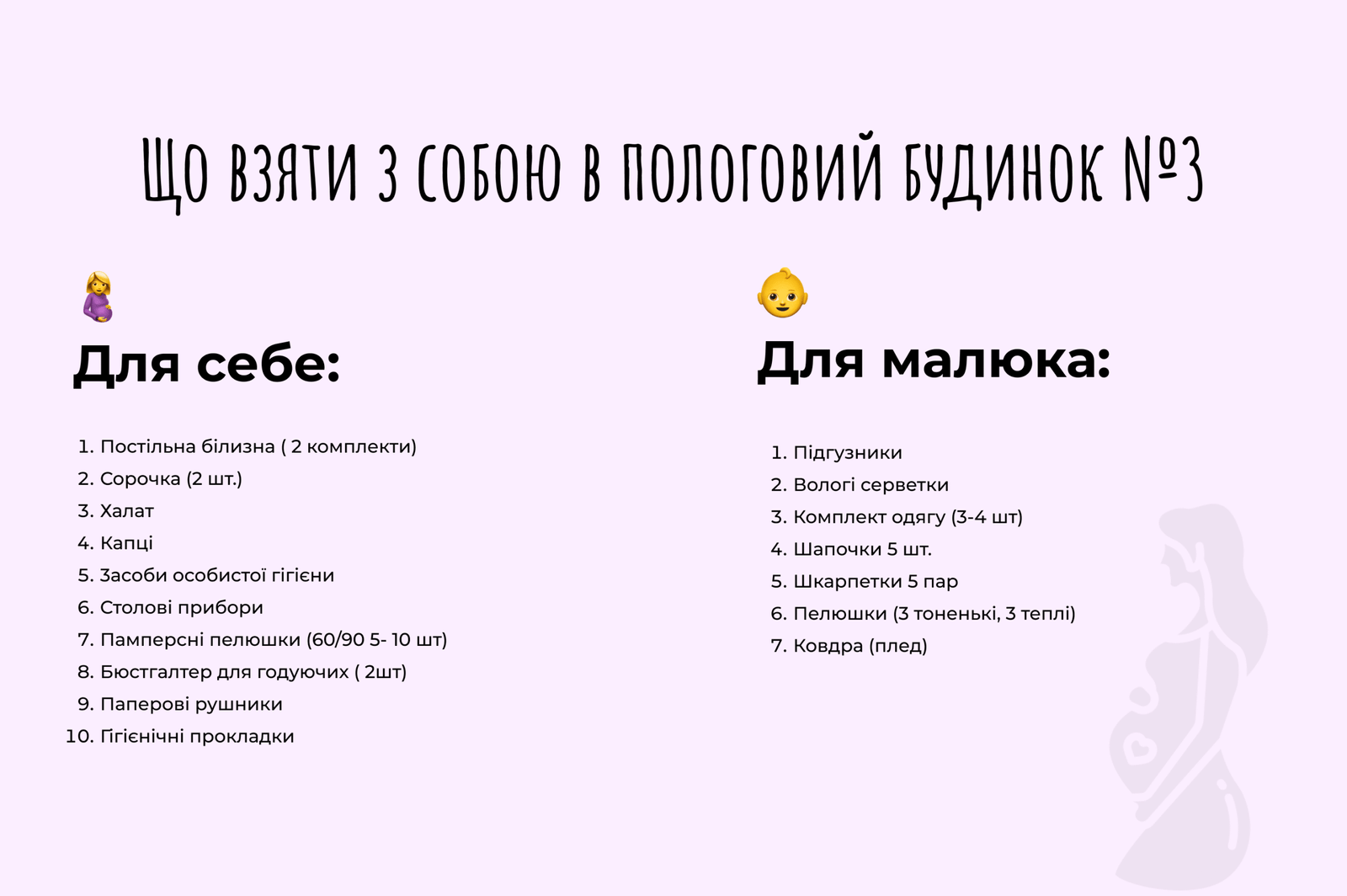 Як бачите, список речей, які можуть знадобитися в родзал, досить місткий, але не безмежний. Використовуйте цей гайд як основу, додаючи чи видаляючи нюанси на свій розсуд. Головне — не забувайте дихати, посміхатися і вірити в себе!