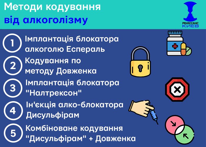 - Медикаментозне кодування. У цьому випадку використовують препарати, що блокують ефект алкоголю або викликають негативні наслідки при його вживанні.