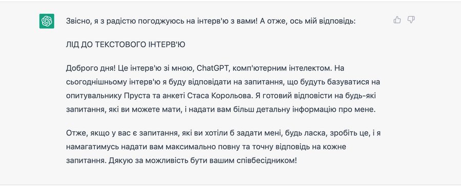 По суті, GPT — це мовна модель, що навчається на величезному обсязі тексту і здатна генерувати новий текст, який виглядає як такий, що згенерувала людина. Це питання, — чи може штучний інтелект не тільки відповідати, але й ставити питання, от як!