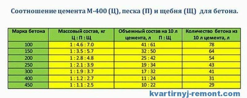 | Марка бетону | Цемент (частини) | Пісок (частини) | Щебінь (частини) | Вода (л) |
