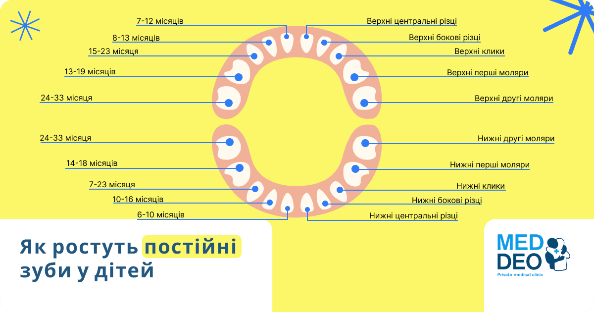 | Вік дитини | Скільки зубів (загалом) | Молочні зуби | Постійні зуби |