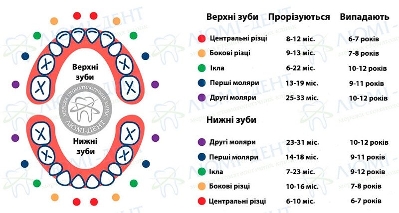 Перша хвиля прорізування зубів у дітей зазвичай починається приблизно з шести місяців. У цьому віці можуть з’явитися перші нижні центральні різці — маленькі «виховатилі усмішки». Від слідуючих 12 до 18 місяців зазвичай формується більшість молочних зубів.