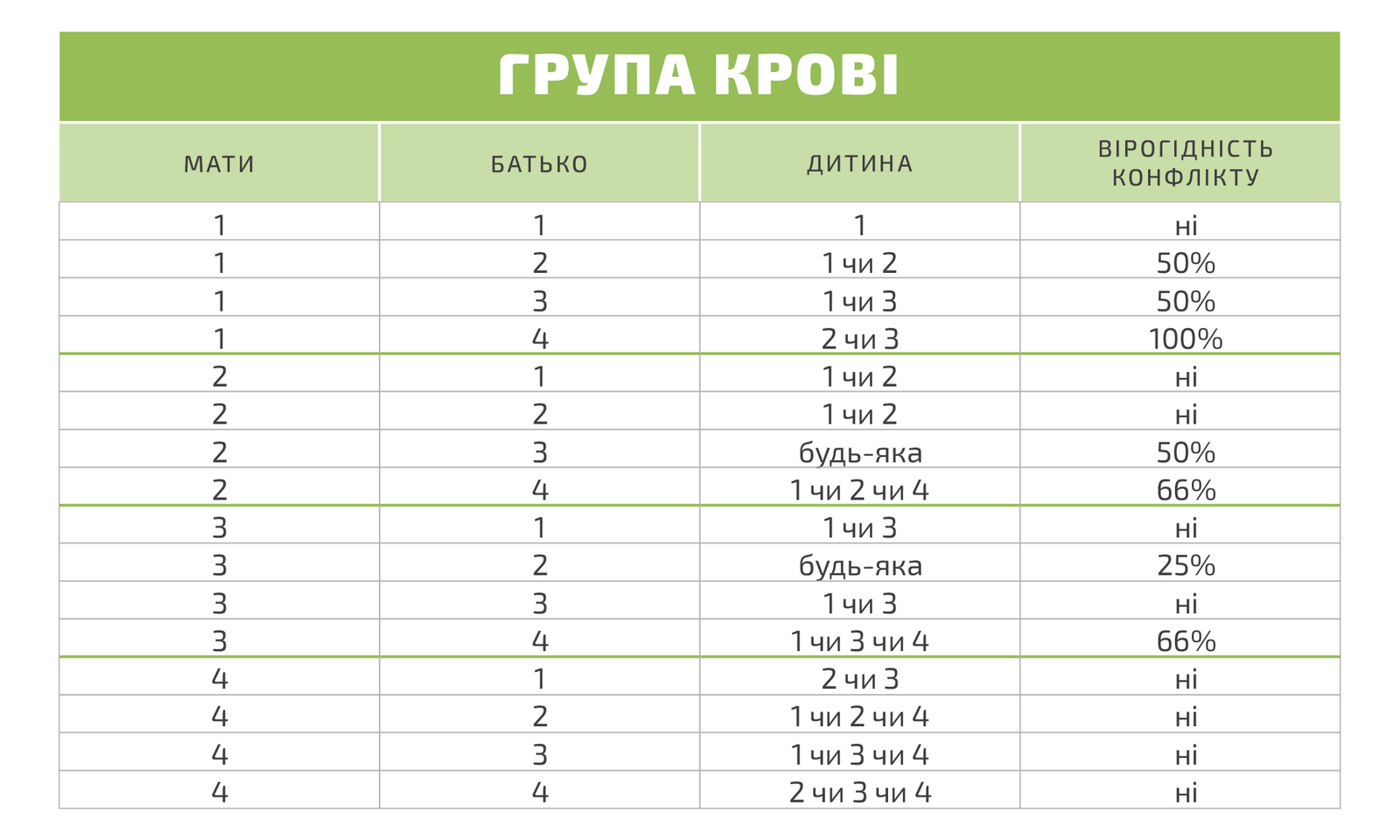 | Стан матері | Стан плоду | Ризик конфлікту |