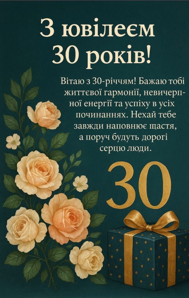 З ювілеєм 30 років! Це символ мудрості, досвіду, зрілості. Багато хто називає цей вік «новою молодістю». Час, коли ви знаєте себе. Розумієте, чого саме хочете від життя. І хоч на вашому боці вже накопичився досвід, все одно прагнете нових вершин.