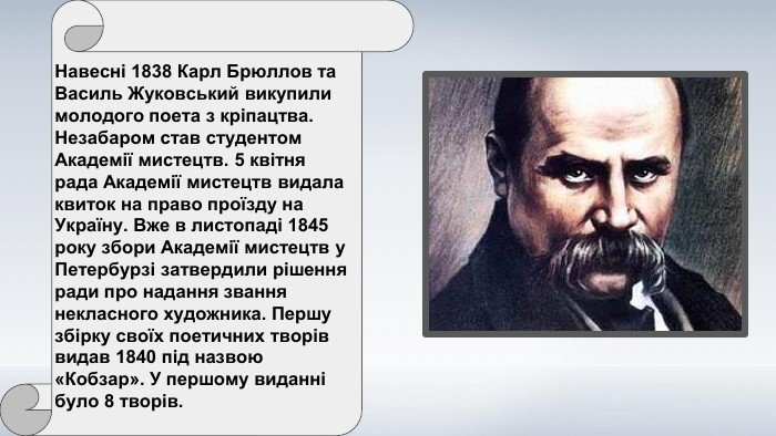 У 1838 році Тарас отримав давно бажану свободу. Він почав навчатися у Петербурзькій академії мистецтв, читав, малював і вивчав таїни творчості. Але головне — Тарас зміг нарешті писати своїм голосом. Видання “Кобзаря” у 1840 році стало знаковою подією. Це була не просто збірка віршів — це був голос його серця, джерело, з якого лилося світло…