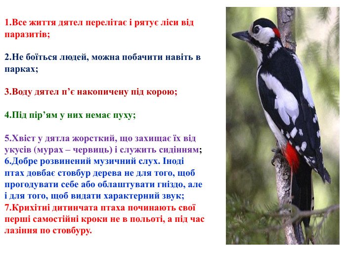 Дятли – це невеликі пташки з короткими ногами та міцними дзьобами. Чому такий дзьоб? Він ідеально підходить для довбання дерев і добування їжі. Їхнє тіло пристосоване для вертикального переміщення деревами.