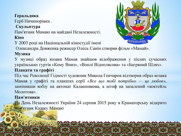 Козак Мамай – це не просто легенда, це символ волелюбного українця. Йому приписуються надлюдські здібності. Мамай завжди зображений з кобзою, символом свободи та мріяння. Він уособлює подвиг, хоробрість і душевний спокій.