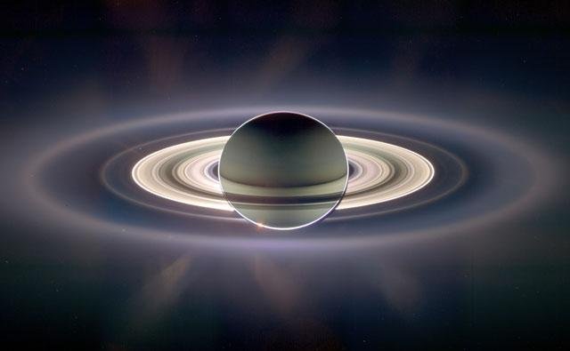 Сатурн, ти мабуть думаєш, виглядає з кілець ніби одягнений у химерний капелюх. Але ці кільця складаються переважно з льоду і каменю. Не повірите, але вони такі яскраві, що на них можуть сутінки з’являтись від кольорової гри! Це наче дивитись на небачене у світлі далекої планети в телескоп.