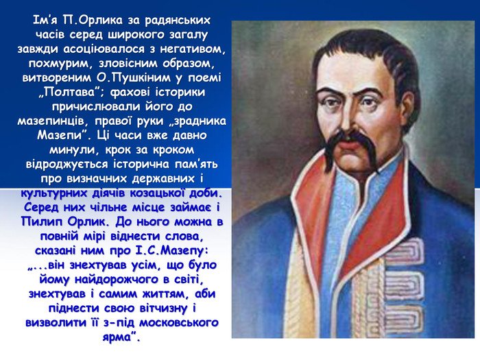 Для справжніх козаків Орлик був символом боротьби. Його поривали на прапорі незалежності України, навіть коли ґрунт під ногами тріщав. Ось вже ніби і кінець, та з’являється Орлик, з новими ідеями.