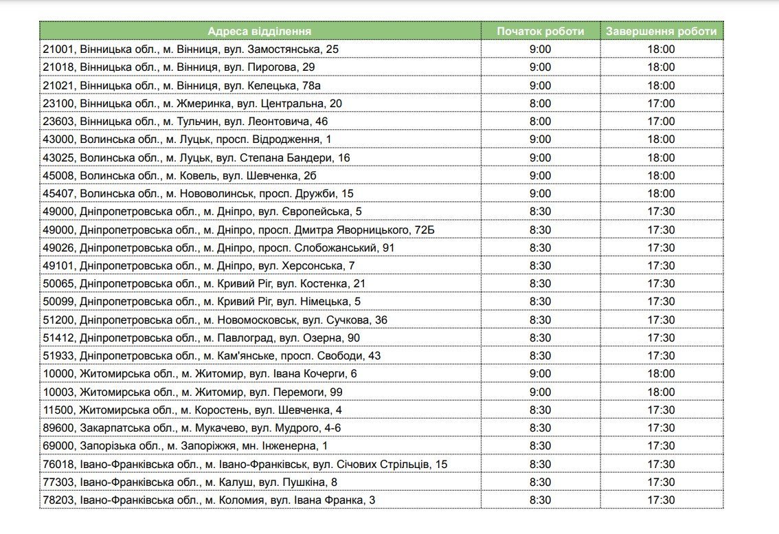 | Місто | Адреса відділення | Графік роботи у суботу |