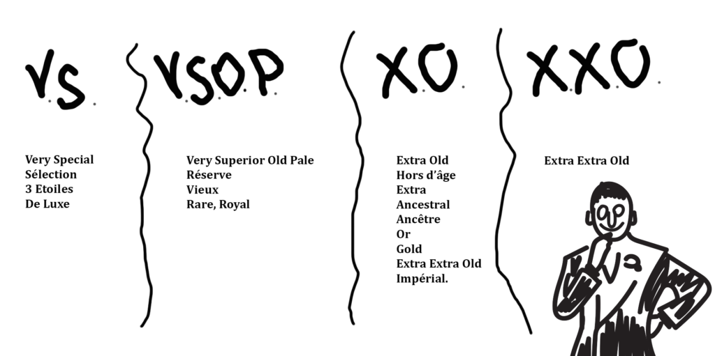 Коньяк — це про час. Класифікація включає три основні категорії: VS (два роки), VSOP (чотири роки) та XO (шість років і більше). Бренді накладає куди менші обмеження на вік напою.