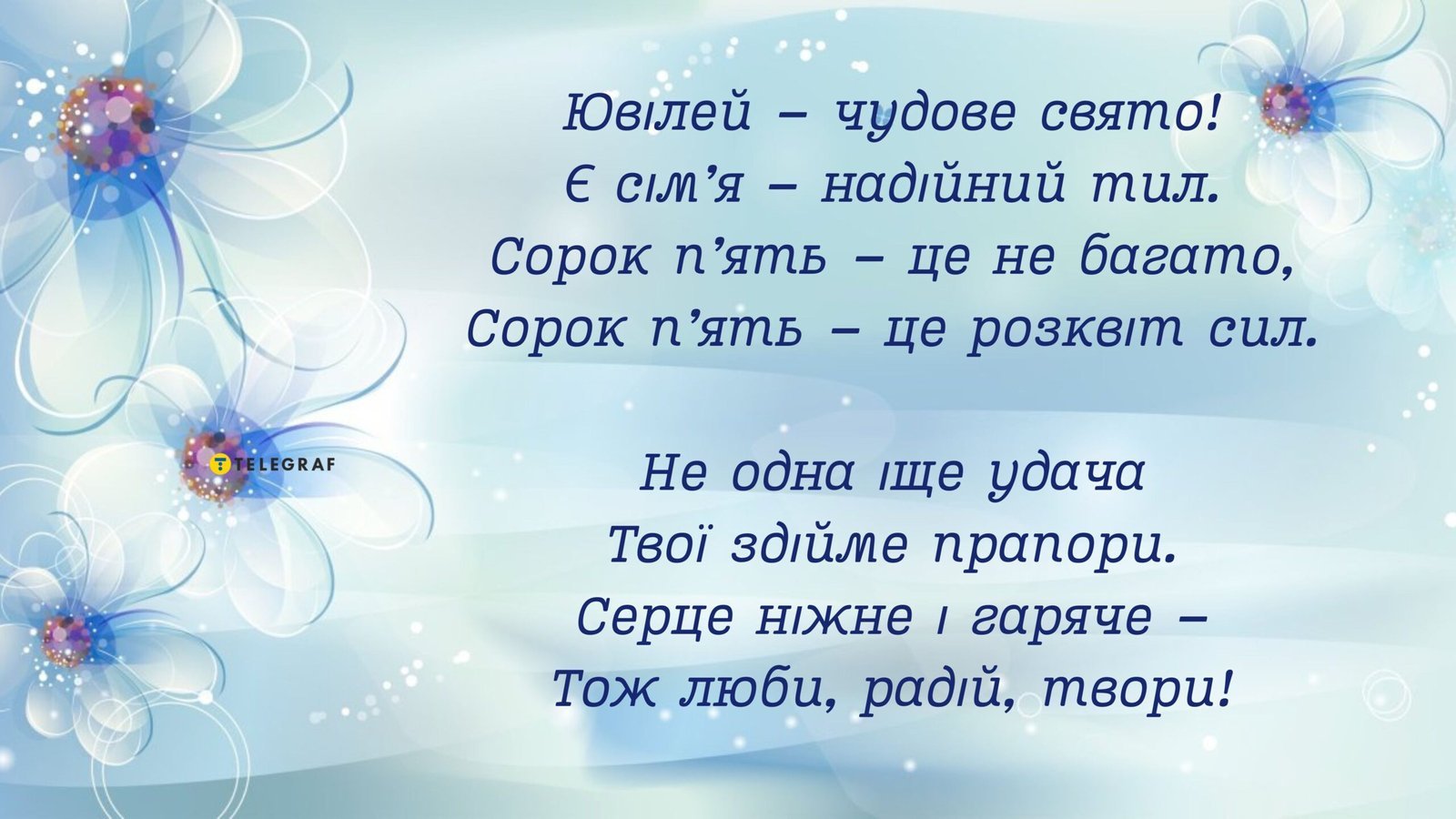 45 - не просто цифра, Це пазл з досвіду та мрій. Світіть, як яскраве світло, Не під коронуйте їхніх снів. Крокуйте стрімко в життя нове, Спокійно, легко — без меж, Нехай вільно серце співає Пісню свободи у всіх акорд.