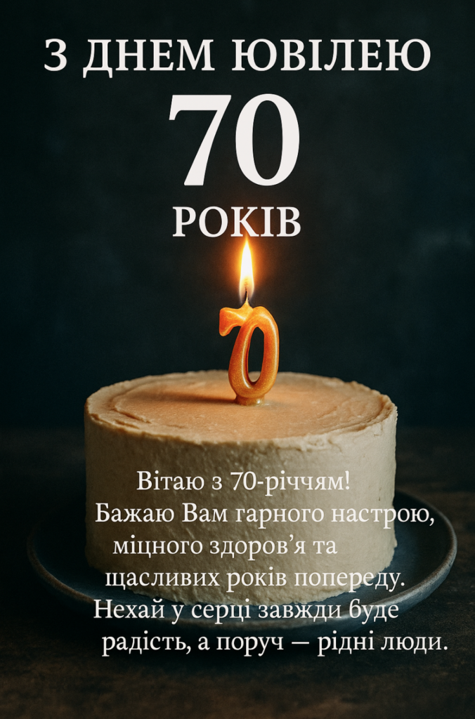 Коли на порозі стоїть ювілей 70 років, слів і почуттів завжди бракує. Це особливий етап, який варто відзначити з гідністю і щирими емоціями. Вітаючи чоловіка з такою визначною датою, ми не лише озираємось назад, але й дивимось вперед, бо життя продовжується! І воно сповнене можливостей.