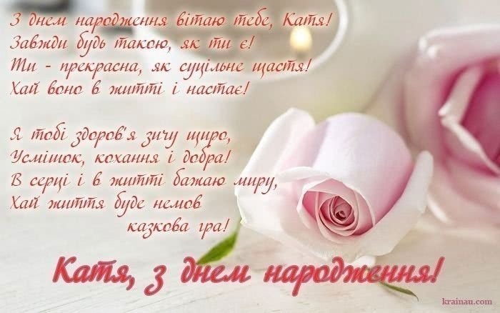 З днем народження, Катю! Крокуй вперед сміливо і з посмішкою. Життя прекрасне, і воно саме для тебе. Бажаємо зустріти незабутні пригоди і щасливі моменти, що надихнуть на нові звершення. Життя — воно лише починає розкривати свої секрети для тебе. Насолоджуйся цим!