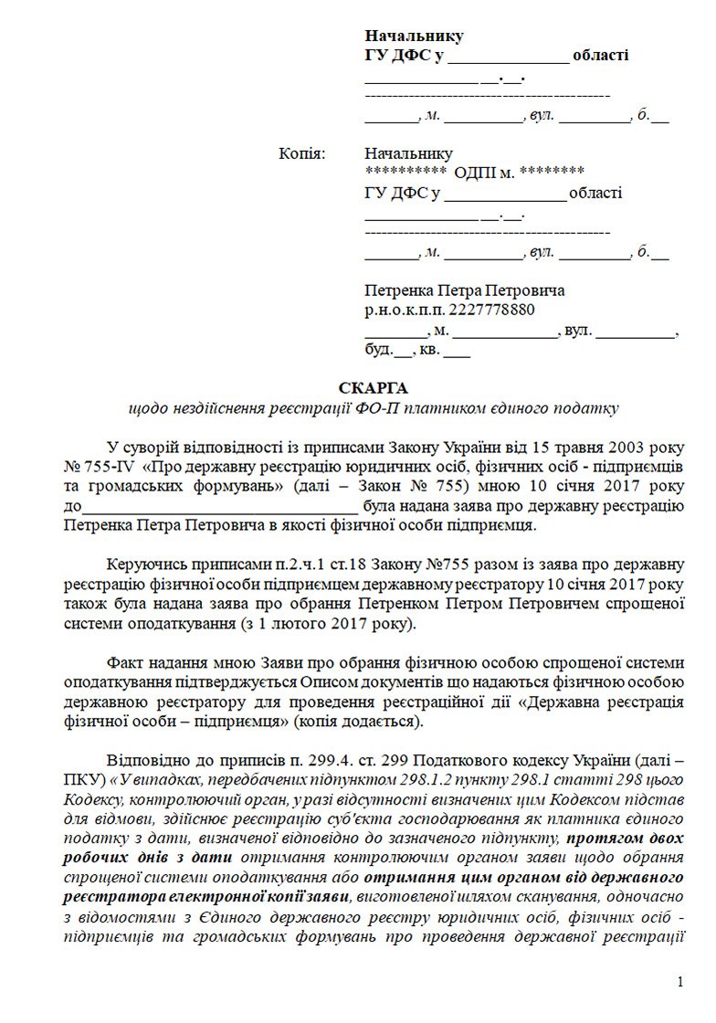 Розглянемо ситуацію, коли платник єдиного податку стикається з неправомірними діями податкової служби. Як скласти скаргу, яка враховує специфіку цього випадку?