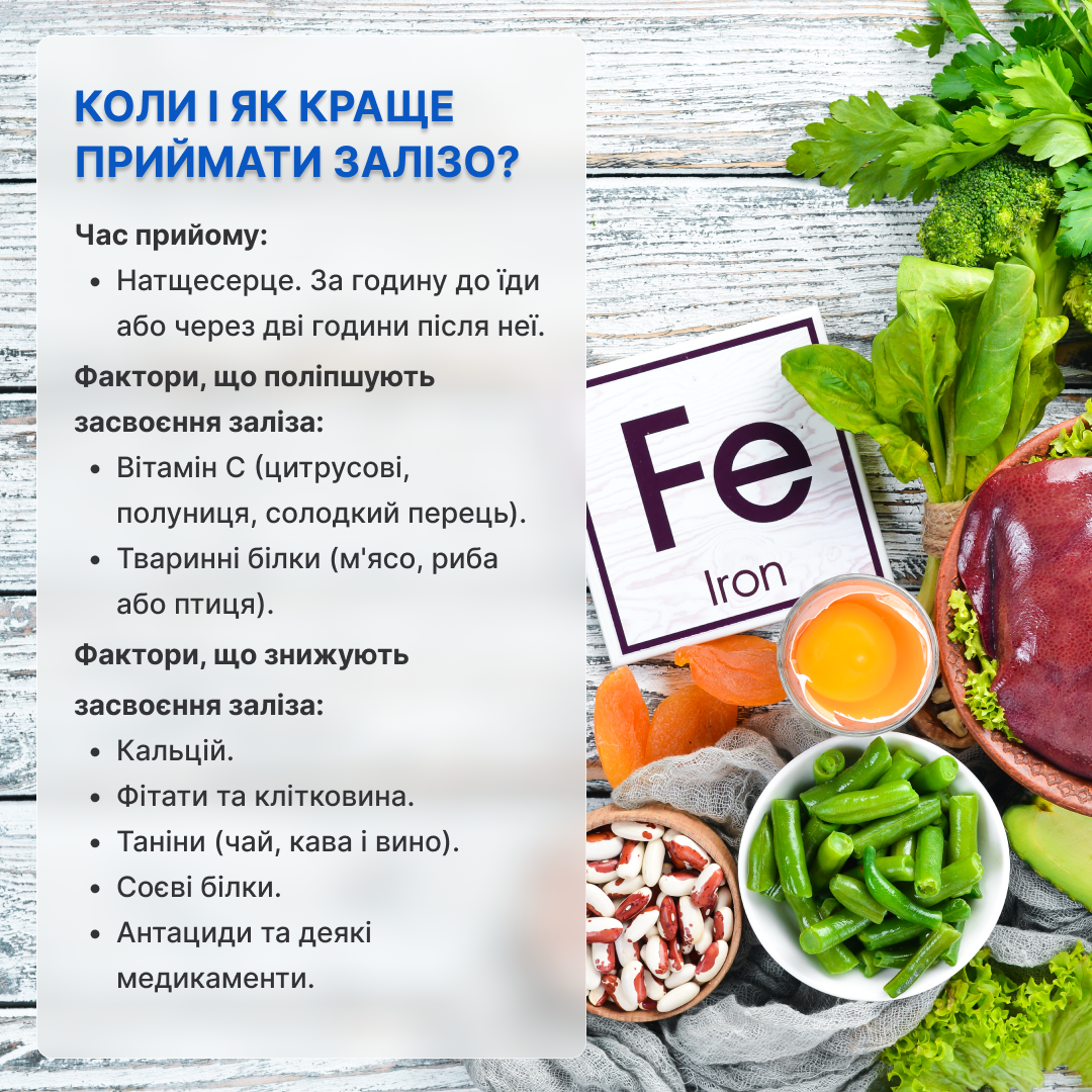 Для оптимального засвоєння заліза в організмі важливо враховувати декілька ключових аспектів при його прийомі:
