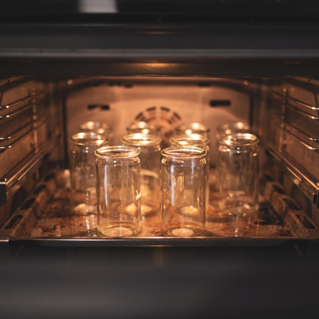 - Попереднє нагрівання духовки: Встановіть температуру духовки на 120 °C. Це оптимальна температура для знищення більшості патогенних мікроорганізмів без пошкодження скла.