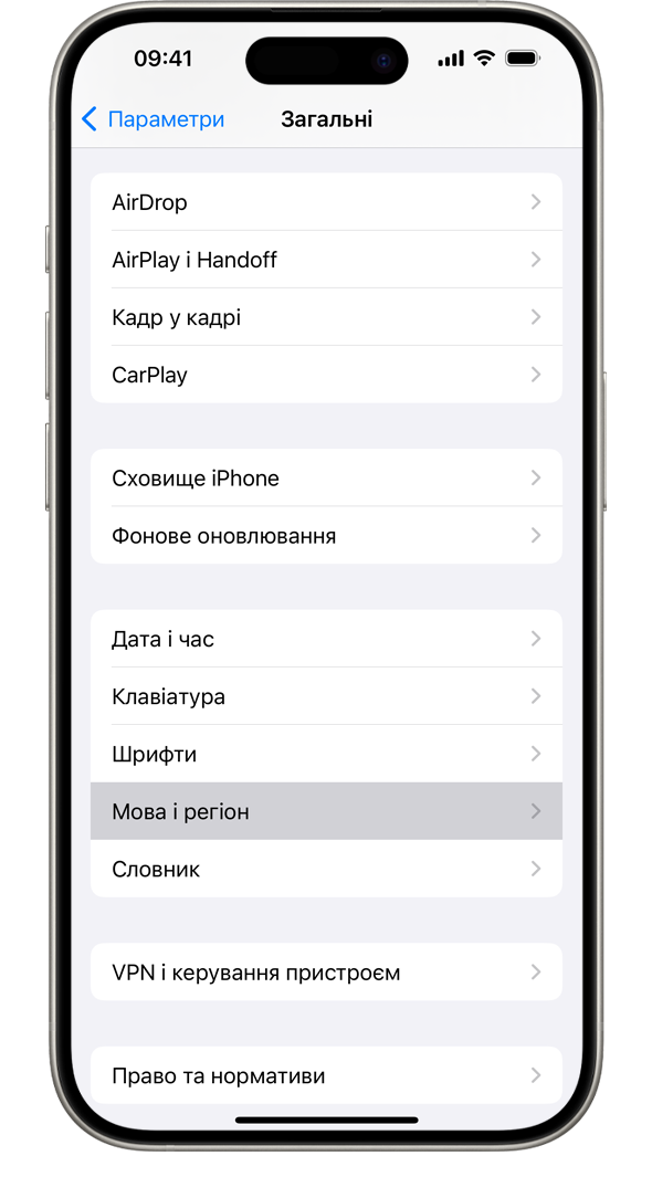 - Знайдіть пункт «Мова та регіон»: У розділі «Загальні» перегортайте вниз до пункту «Мова та регіон», а потім натисніть на нього.