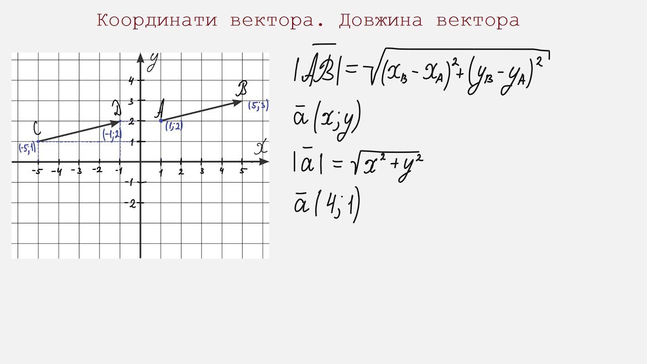 - Розв’язок: Застосуємо формулу: (sqrt{3^2 + 4^2} = sqrt{9 + 16} = sqrt{25} = 5). Довжина вектора дорівнює 5.