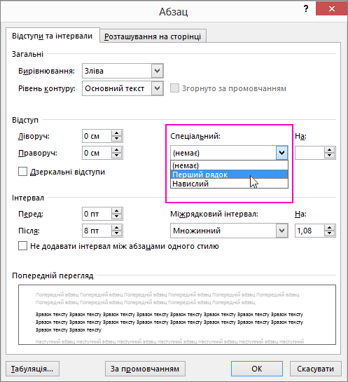 - У вікні параметрів абзацу у розділі Відступи знайдіть поле Перше рядок і виберіть Відступ.