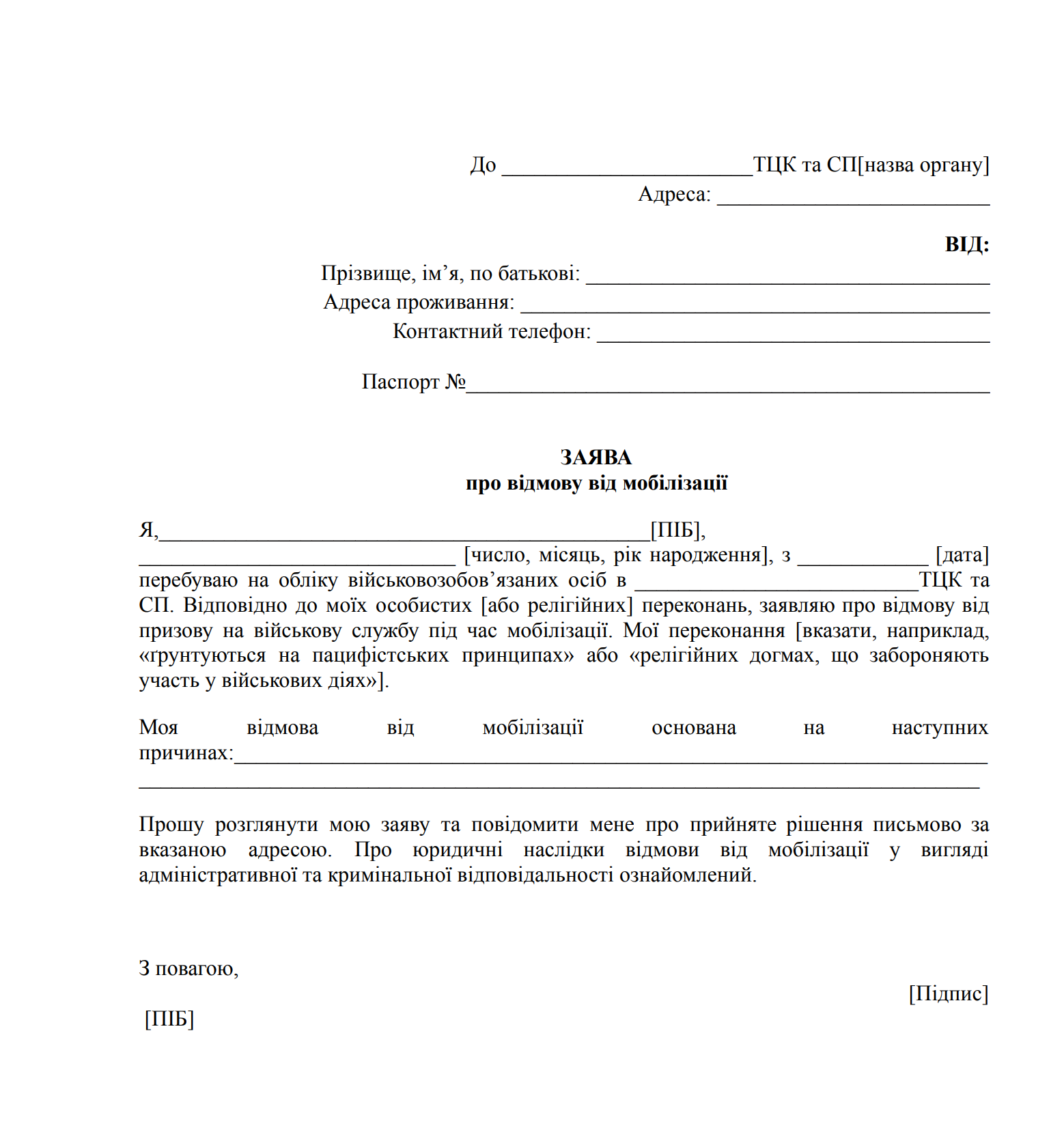 - Заява про відмову від мобілізації: зразок та особливості подання